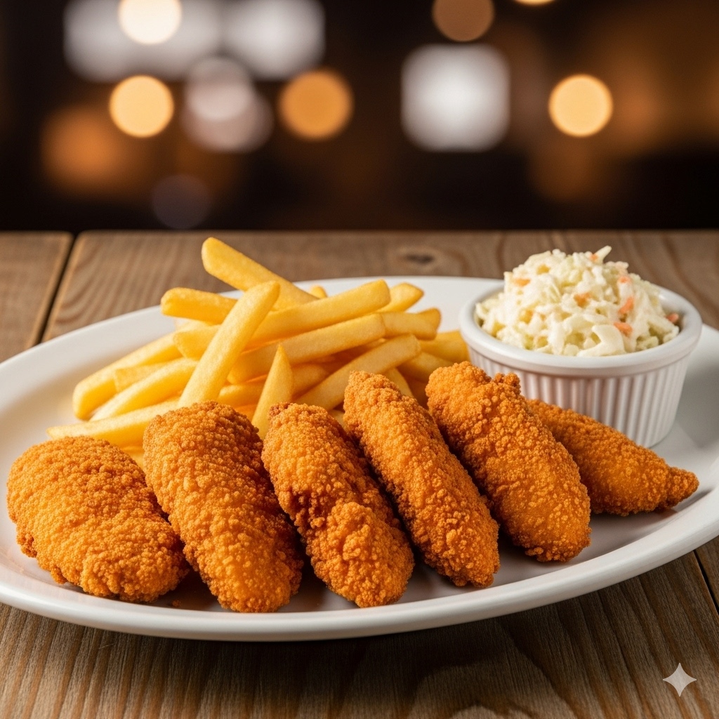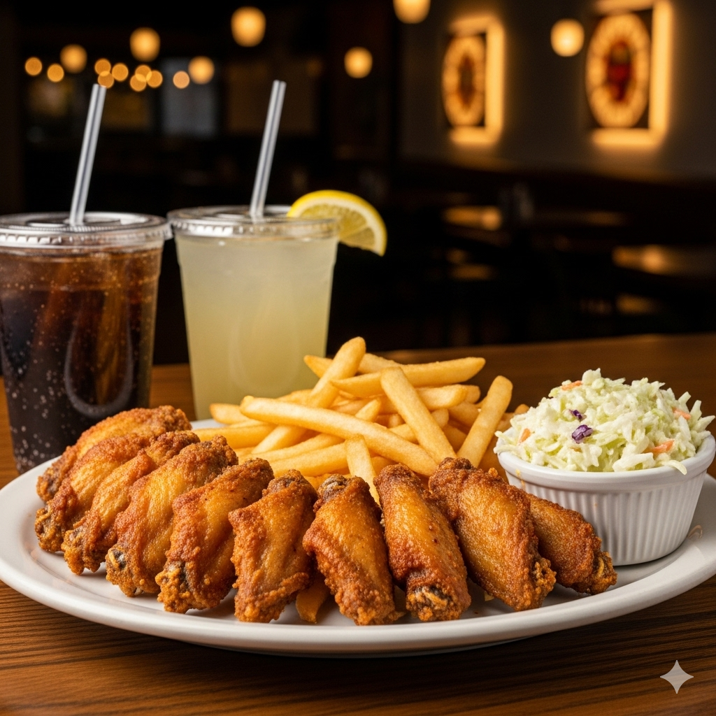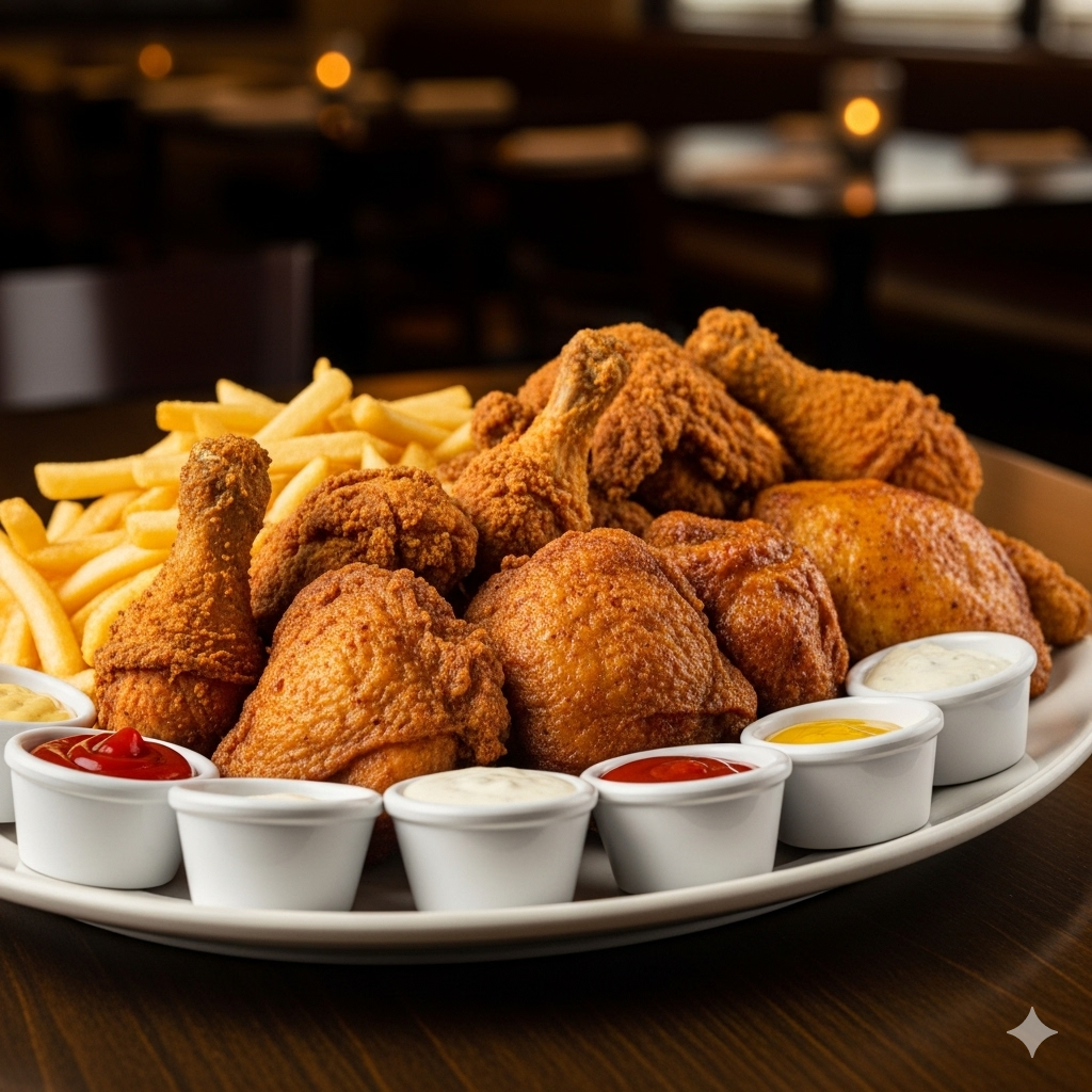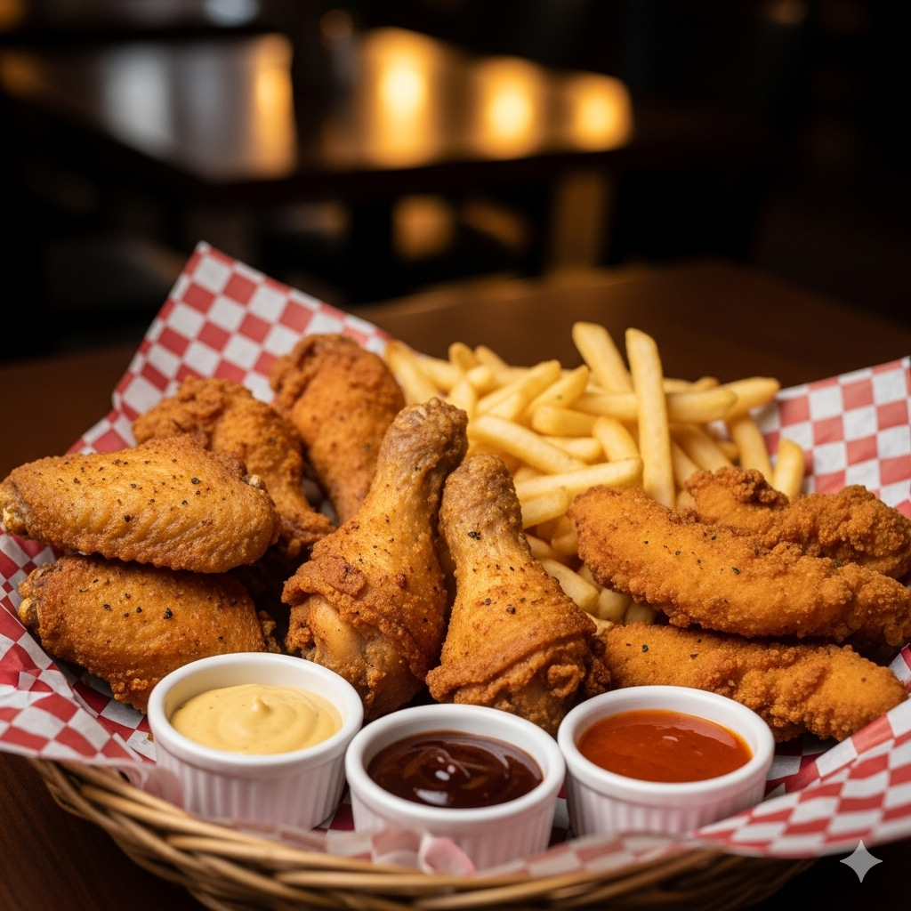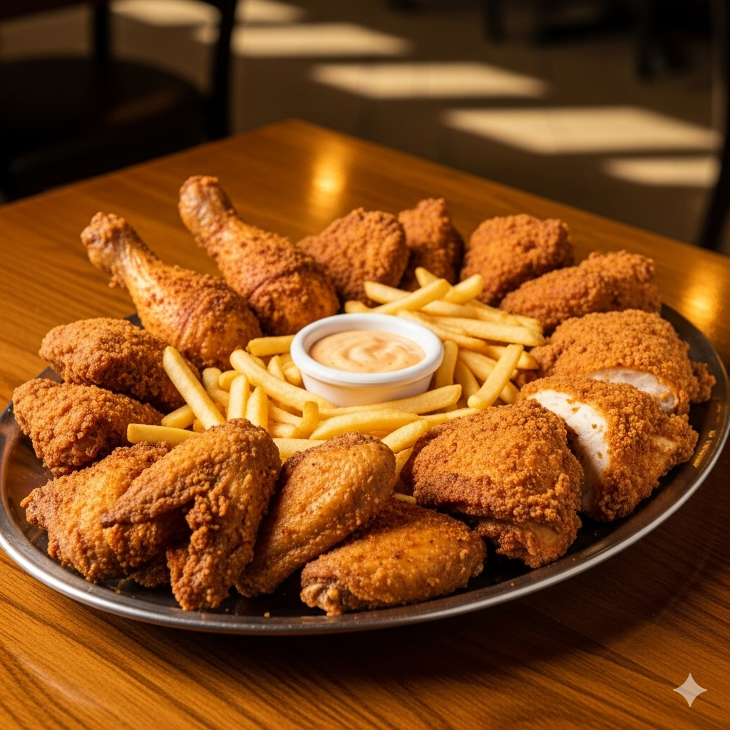 6 Alitas, 6 Filetes, 6 Piernas, 3 Pechugas, Papas Fritas