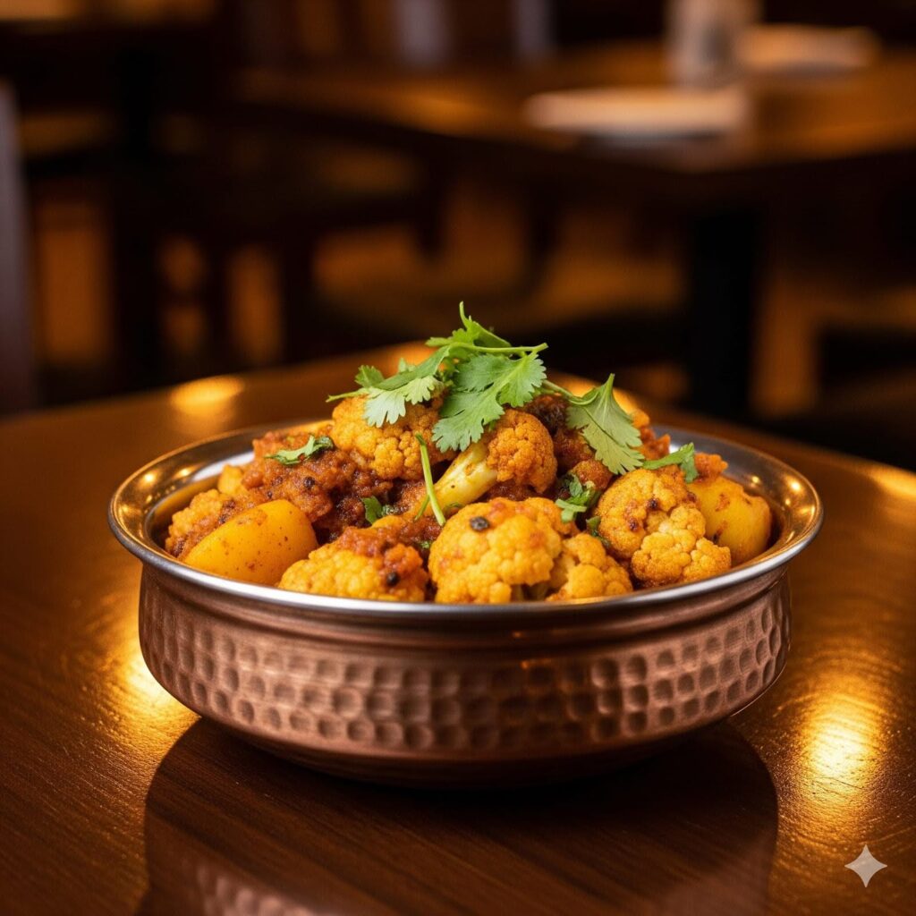 Coliflor y patatas cocidas con cebolla, mostaza y semillas de comino yuna mezda de especias