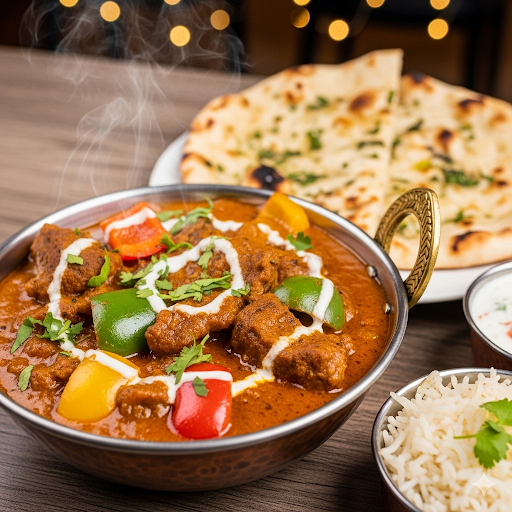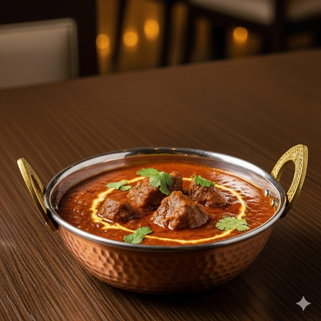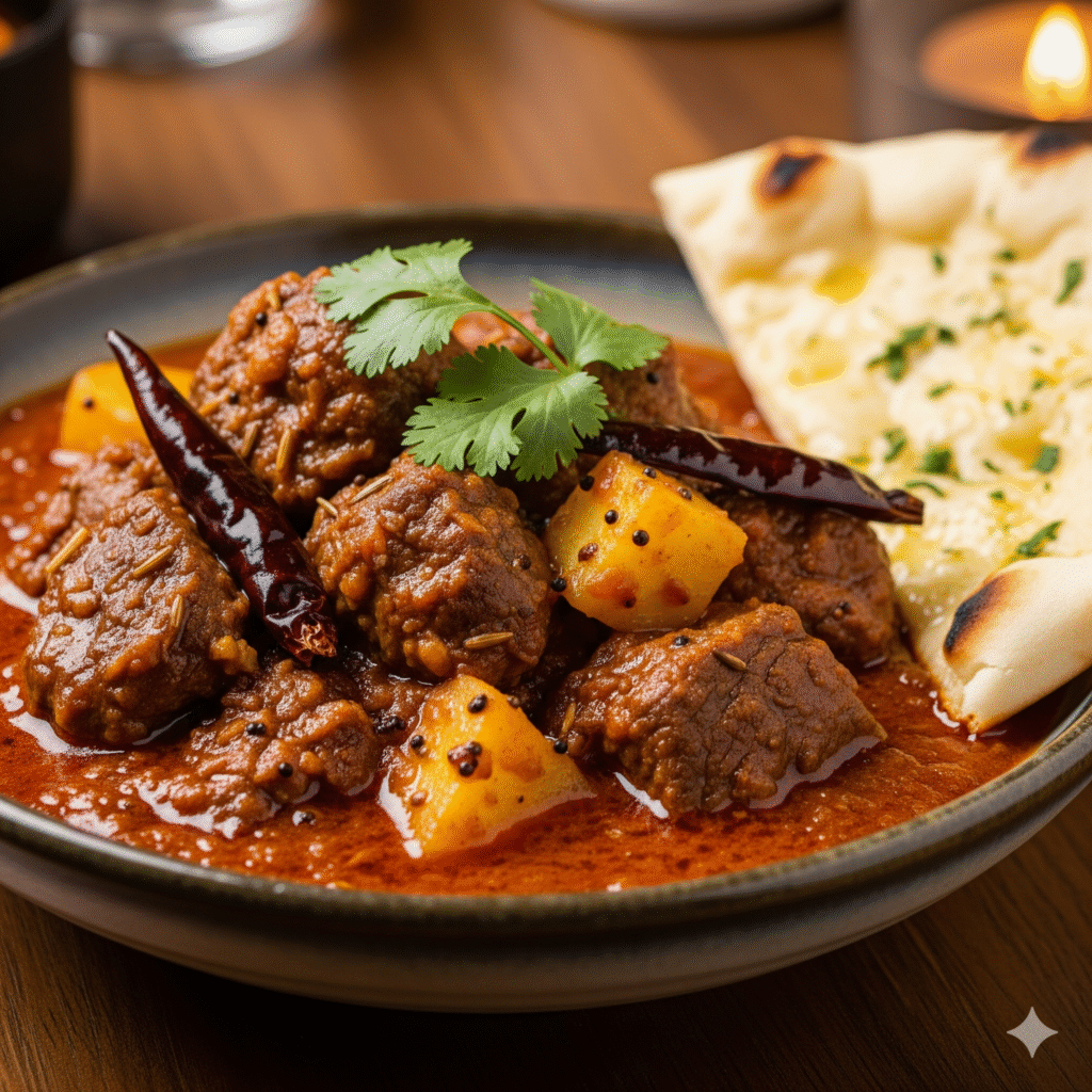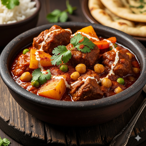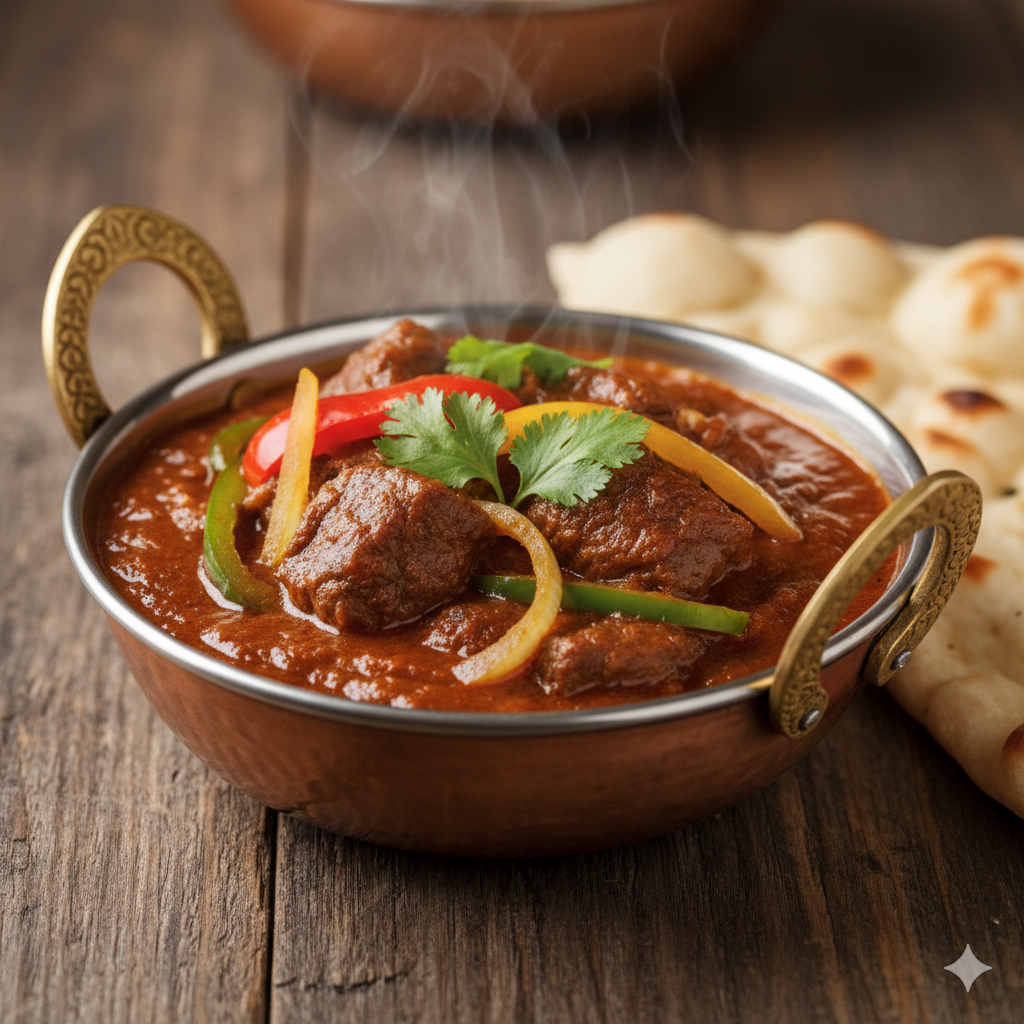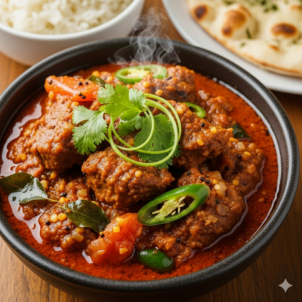 Carne de Ternera cocido en una salsa vindaloo con cebolla, tomate