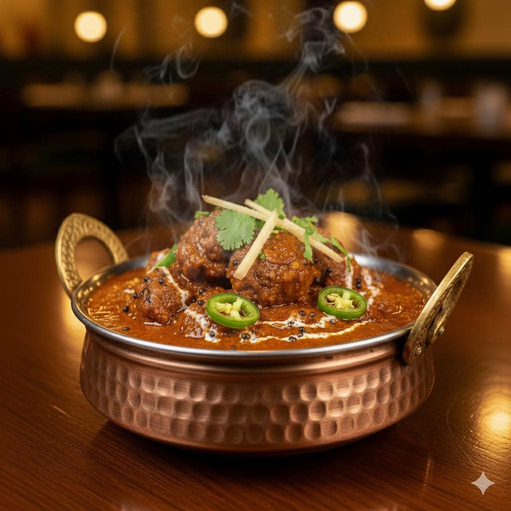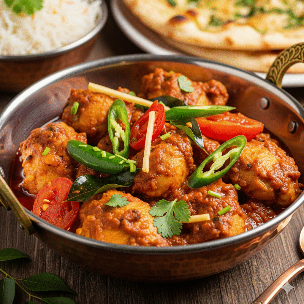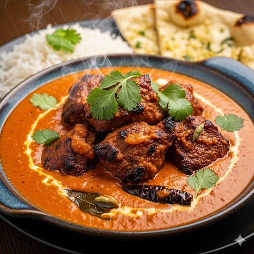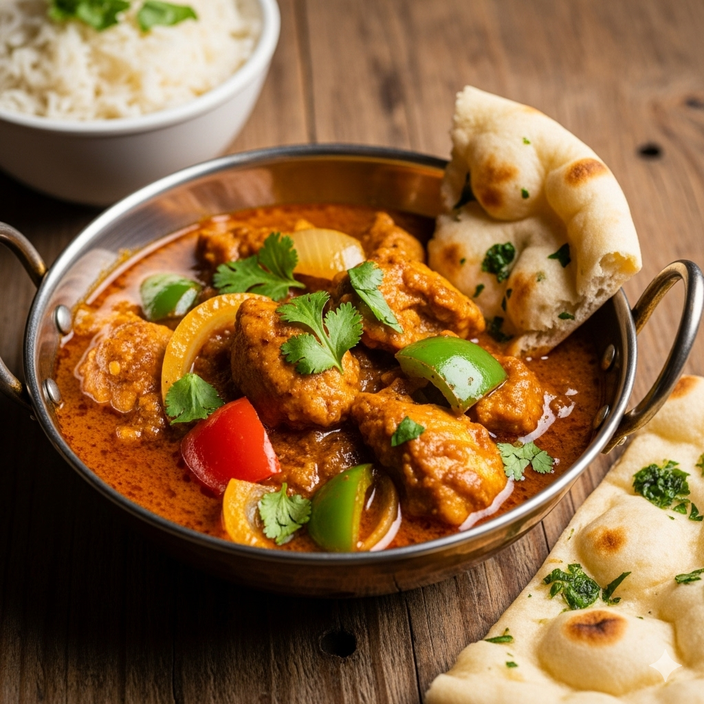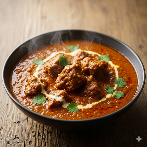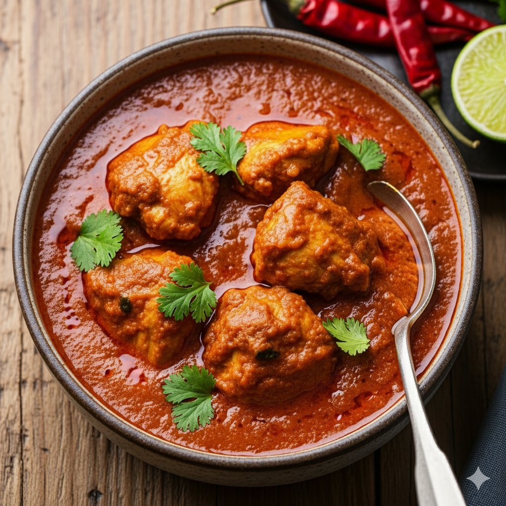 Carne de Ternera cocido en una salsa vindaloo con cebolla, tomate