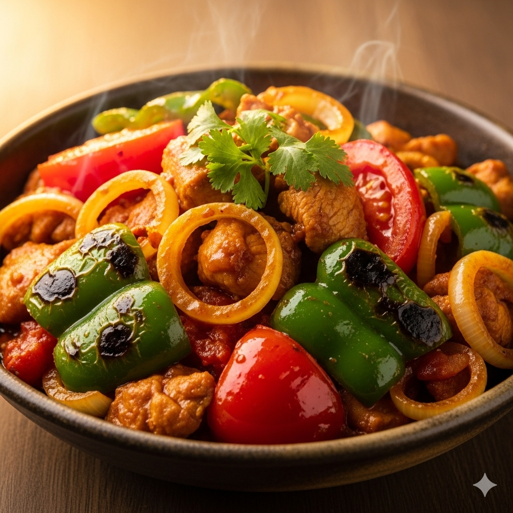 Pollo, Tomate, Cebolla, Pimiento verde Frito