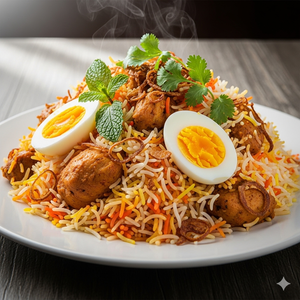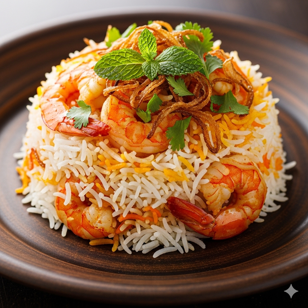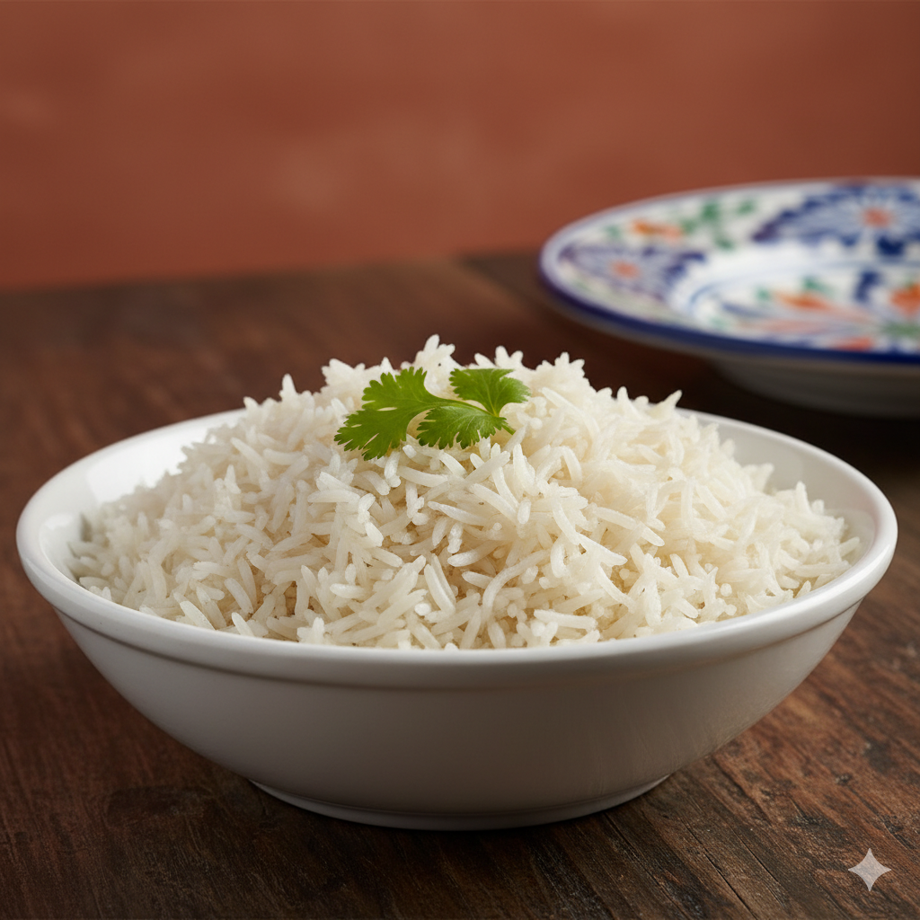 Arroz Basmati cocido con especias y gulsantes suaves fritos