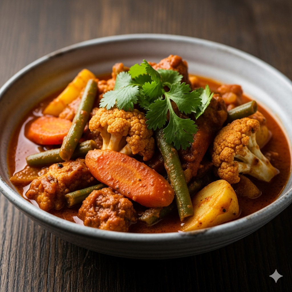 Un surtido de verduras frescas cocidas en una mezcla de especias