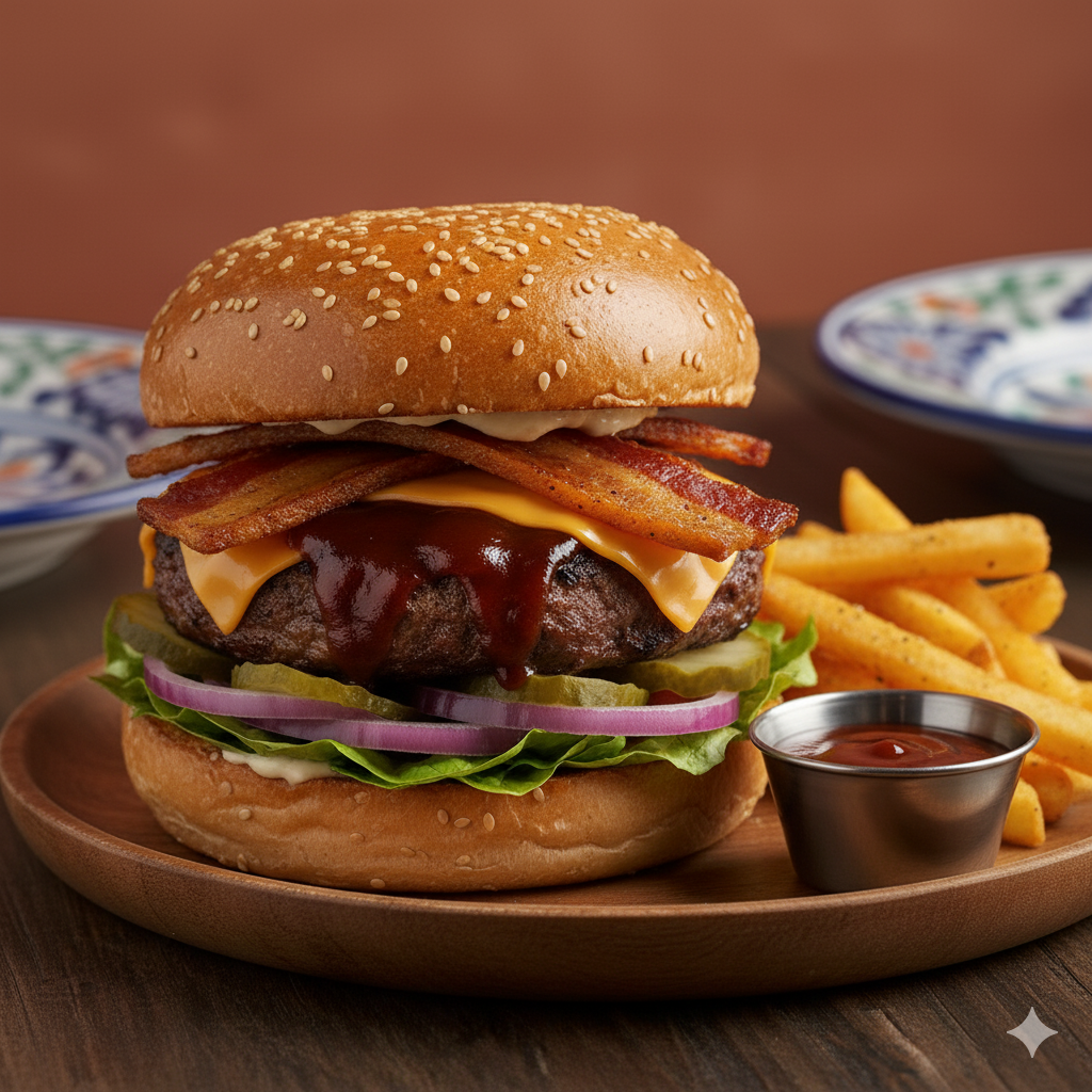 Hamburguesa BBQ Halal: Tiras clásicas y salsa barbacoa (BBQ)